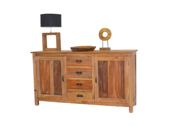 Komoda resp. skříňka z recyklovaného teakového dřeva s jedinečnou patinou, která dodá interiéru osobitý ráz a atmosféru. Každý kus je jedinečný. Čtyři šuplíky a dvoje dvířka jsou i velmi praktická k ukládání věcí. Recyklované dřevo může obsahoval lehké nerovnosti, dírky od původního kování či jiné imperfekce. Je v souladu s podstatou požitého materiálu.
